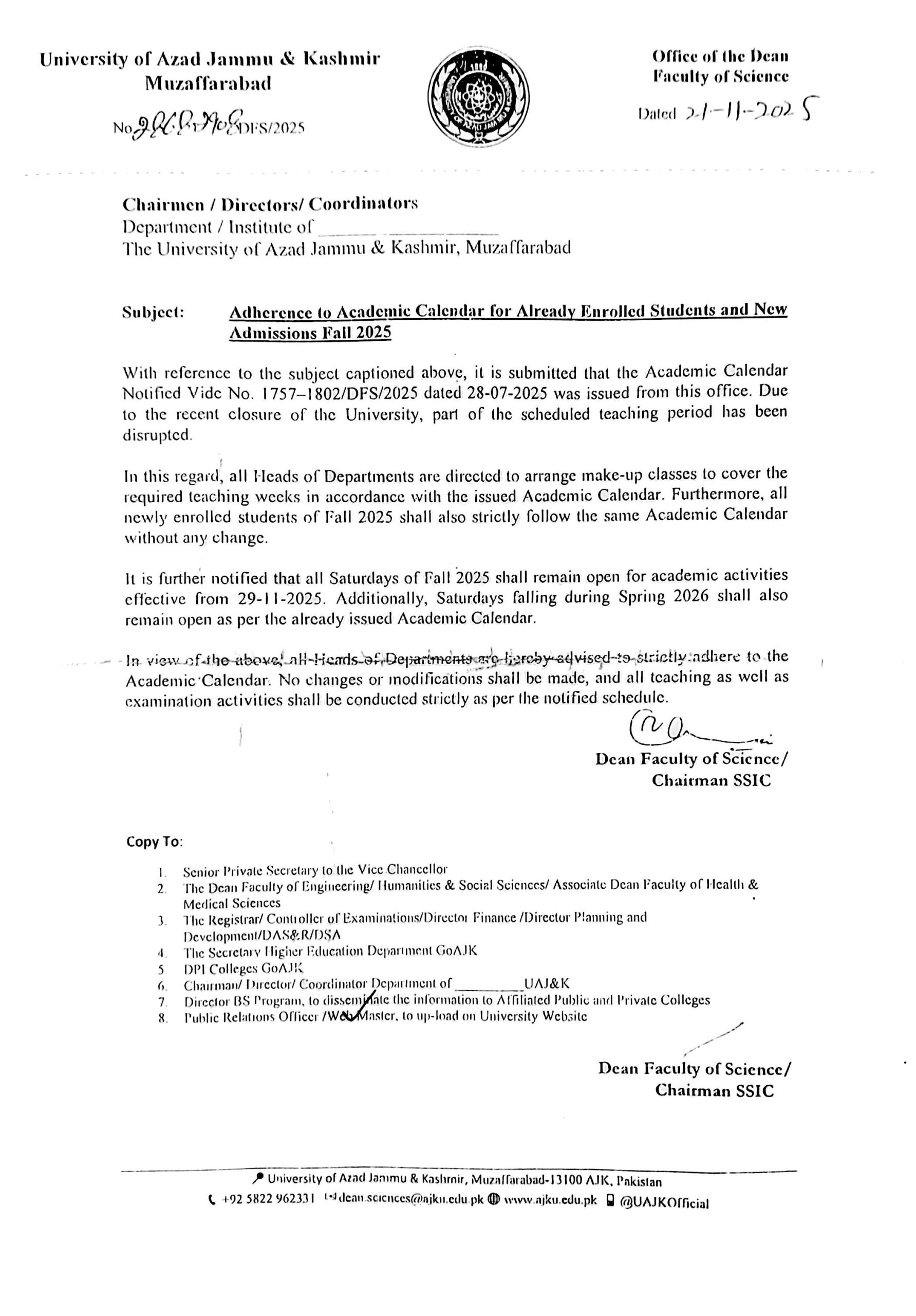 Adherence to Academic Calendar For already Enrolled Students and New Admisssions Fall 2025